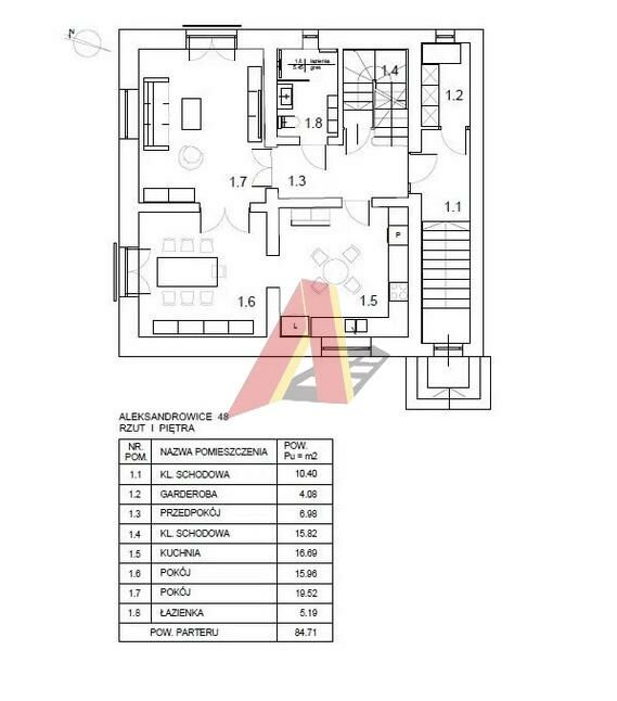 Piętro: - Kl. Schodowa, Garderoba, Przedpokój, Kl. Schodowa, Kuchnia , 2 Pokoje Łazienka. Łączna powierzchnia: 84,71 m2