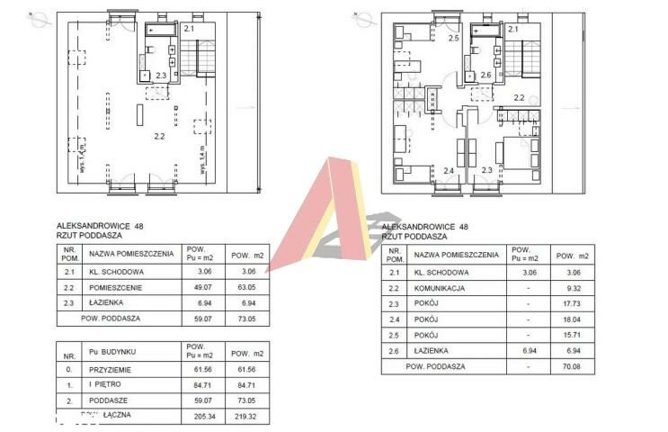Poddasze: - Kl. Schodowa, Komunikacja, 3 Pokoje , Łazienka. Łączna powierzchnia: 73,05 m2 Łączna powierzchnia wszystkich kondygnacji: 219,32 m2 .